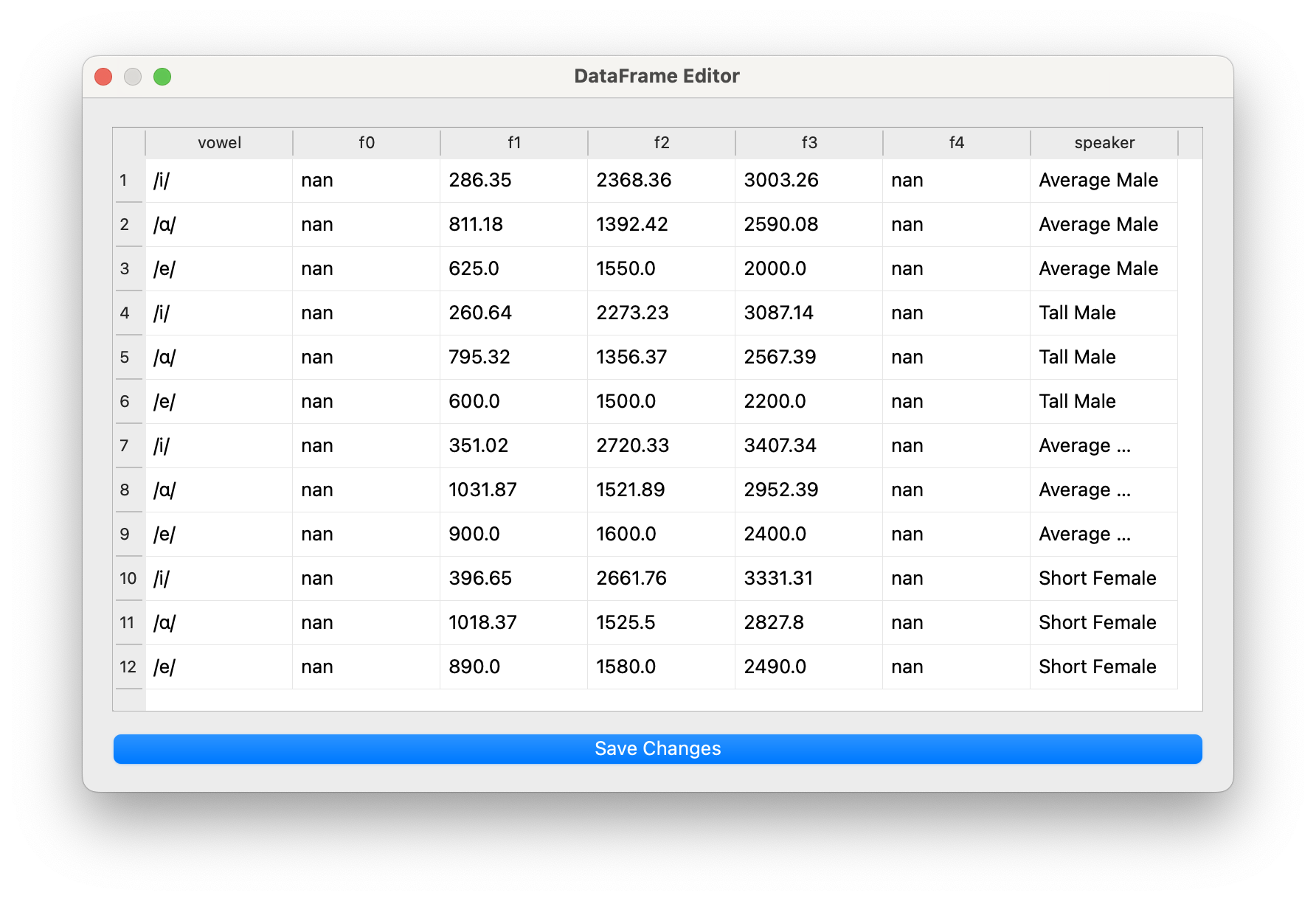 The only necessary rows are ‘vowel’, ‘f1’, ‘f2’, and ‘speaker’. When any data is inputted through the user interface, a dataframe is created with this information. Columns like ‘bark_f1’ for the Bark metric, logarithmic values like ‘log_f1’ and z-scores like ‘zsc_f1’ are also supported.